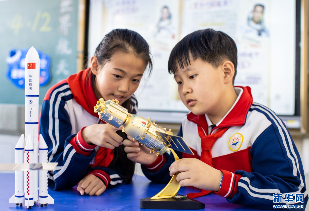 4月11日,呼和浩特市玉泉区石东路小学老师在为学生们讲解中国载人航天知识。新华网发(丁根厚 摄)
