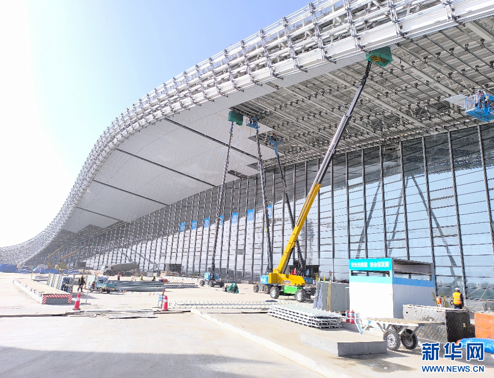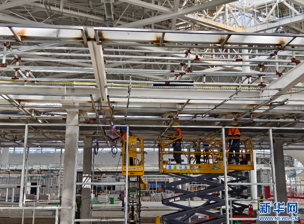 4月12日,建设者在呼和浩特新机场航站楼内施工。新华网 石毅 摄