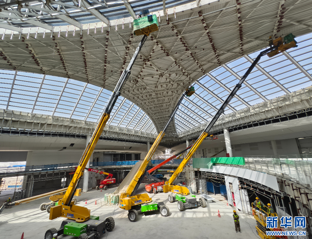 4月12日,建设者在呼和浩特新机场航站楼内施工。新华网 杨腾格尔 摄
