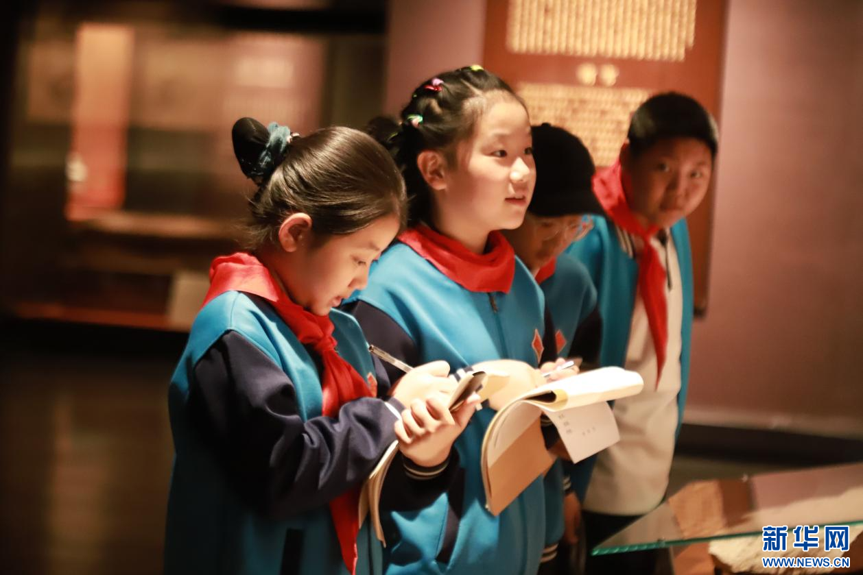 4月18日,内蒙古自治区赤峰市巴林左旗林东第二小学学生在辽上京博物馆参观并作学习记录。新华网发(宋瑞欣 摄)