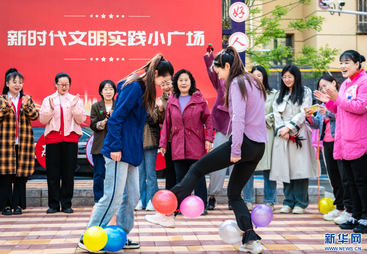 4月29日,呼和浩特市玉泉区清泉街社区的志愿者和居民在参加“踩气球”趣味游戏。新华网发(丁根厚 摄)