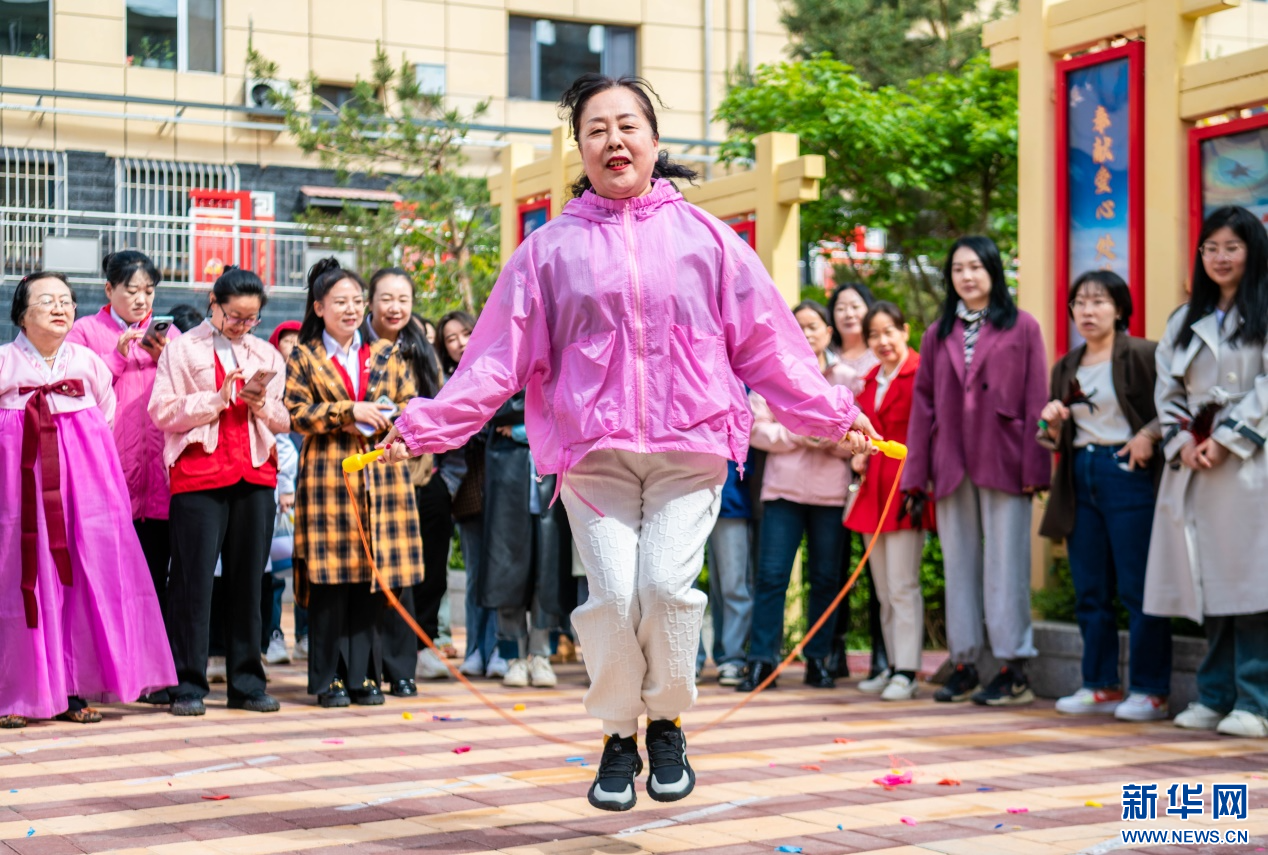 4月29日,呼和浩特市玉泉区清泉街社区居民在参加老年组跳绳比赛。新华网发(丁根厚 摄)
