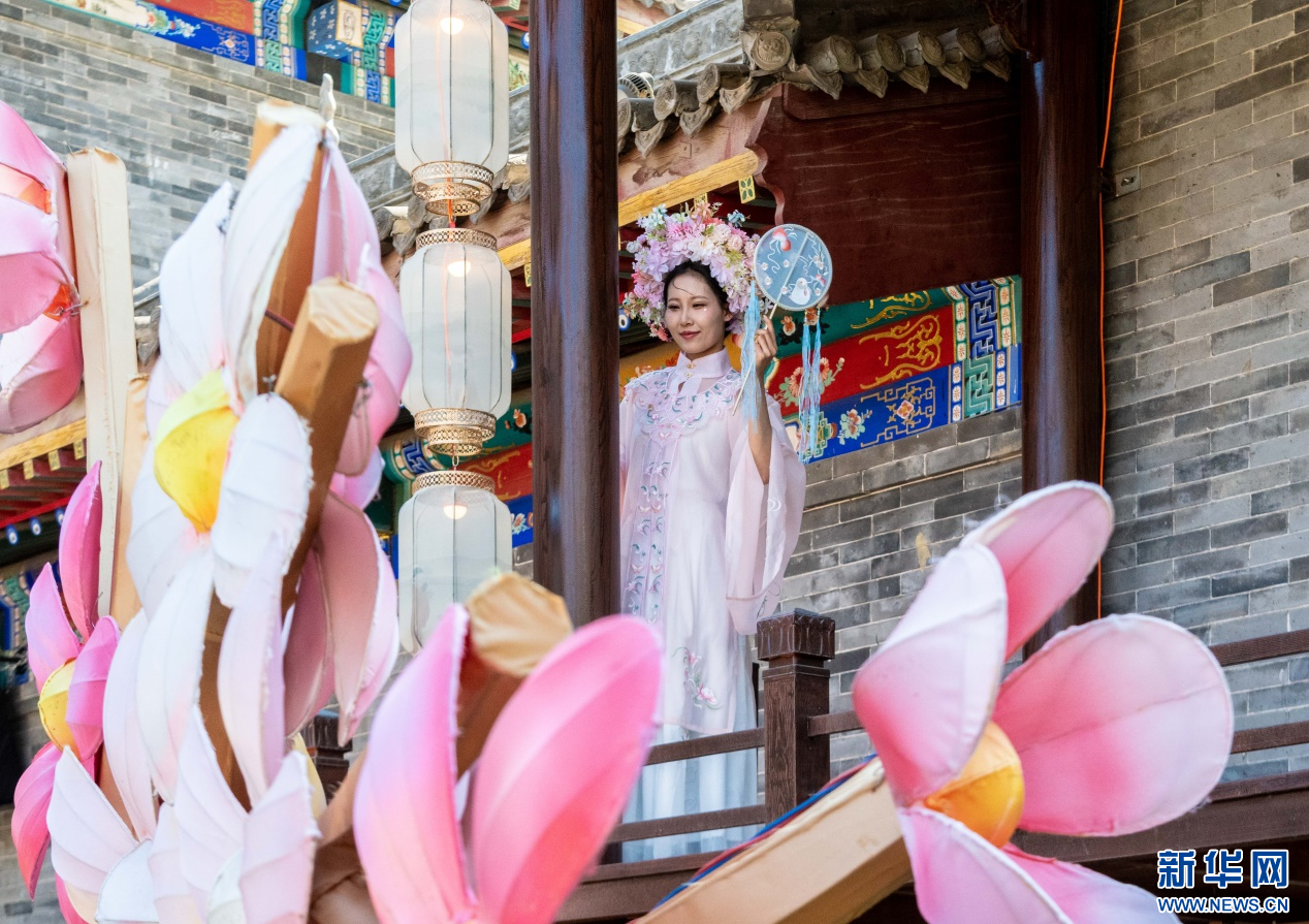 5月1日,旅拍游客在呼和浩特市玉泉区塞上老街旅游休闲街区打卡地拍照留影。新华网发(丁根厚 摄)