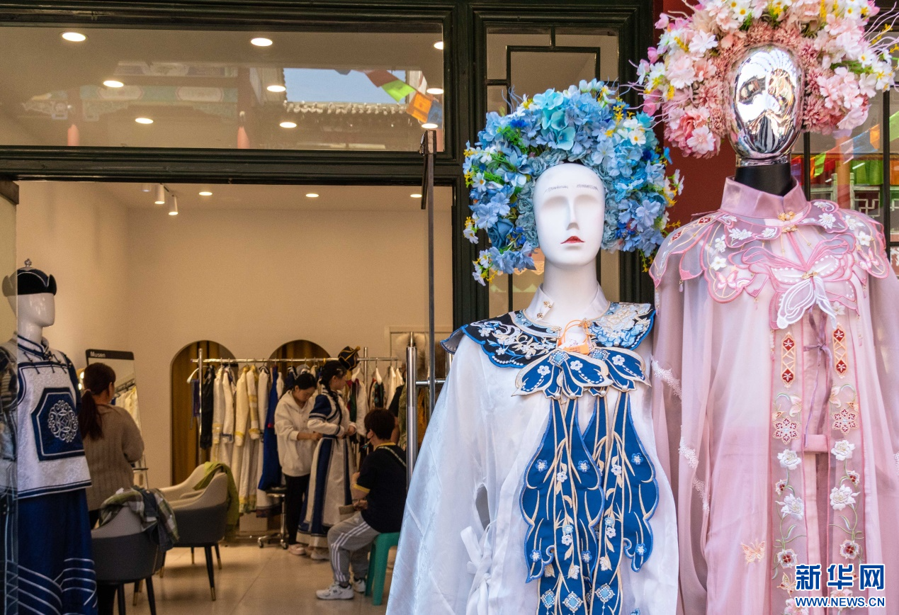 5月1日,旅拍游客在呼和浩特市玉泉区塞上老街旅游休闲街区一家摄影店挑选服饰准备外拍。新华网发(丁根厚 摄)