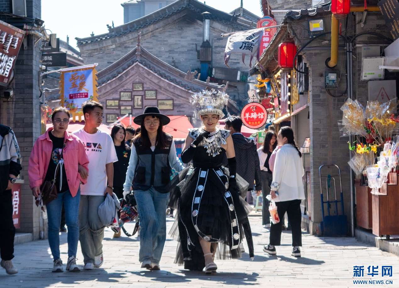 5月1日,游客在呼和浩特市玉泉区塞上老街旅游休闲街区打卡地旅拍。新华网发(丁根厚 摄)
