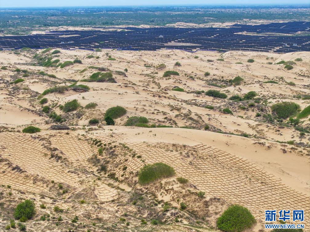 在赤峰市敖汉旗敖润苏莫苏木,沙丘被草方格固定,远处是沙地上建起的光伏发电项目(无人机照片,5月16日摄)。新华社记者 连振 摄