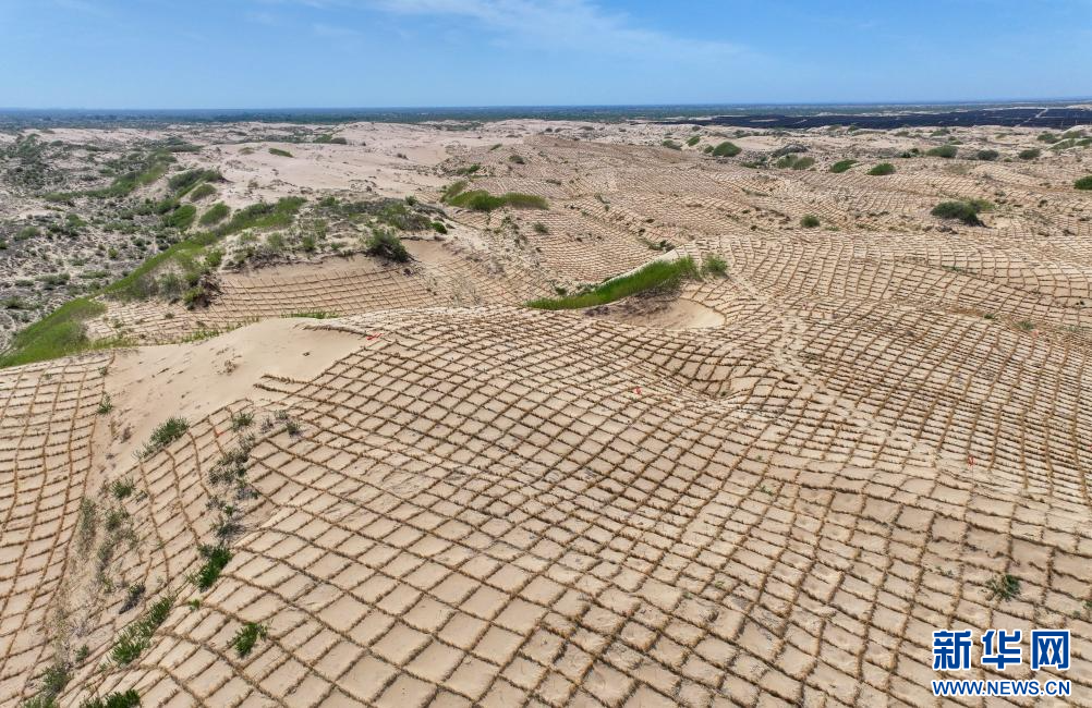 这是在赤峰市敖汉旗敖润苏莫苏木拍摄的被草方格固定的沙丘(无人机照片,5月16日摄)。新华社记者 连振 摄