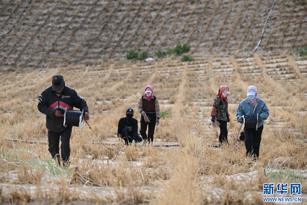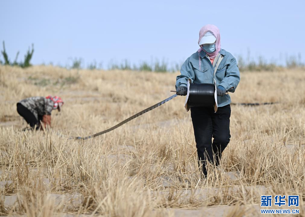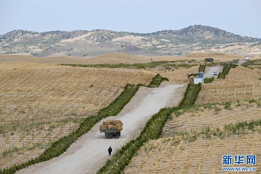 5月16日,在赤峰市翁牛特旗巴彦呼交嘎查其白线防沙治沙项目区,治沙工人在道路两侧拉滴灌带,以提高草方格中的植物成活率。新华社记者 连振 摄