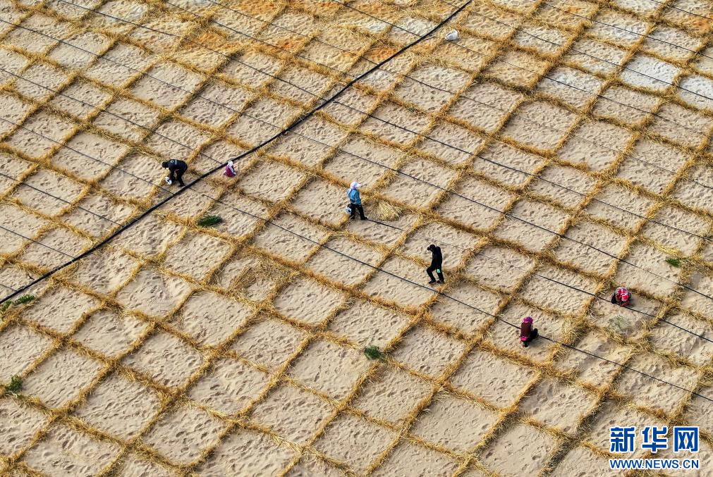 在赤峰市翁牛特旗巴彦呼交嘎查其白线防沙治沙项目区,治沙工人在道路两侧拉滴灌带,以提高草方格中的植物成活率(无人机照片,5月16日摄)。新华社记者 连振 摄