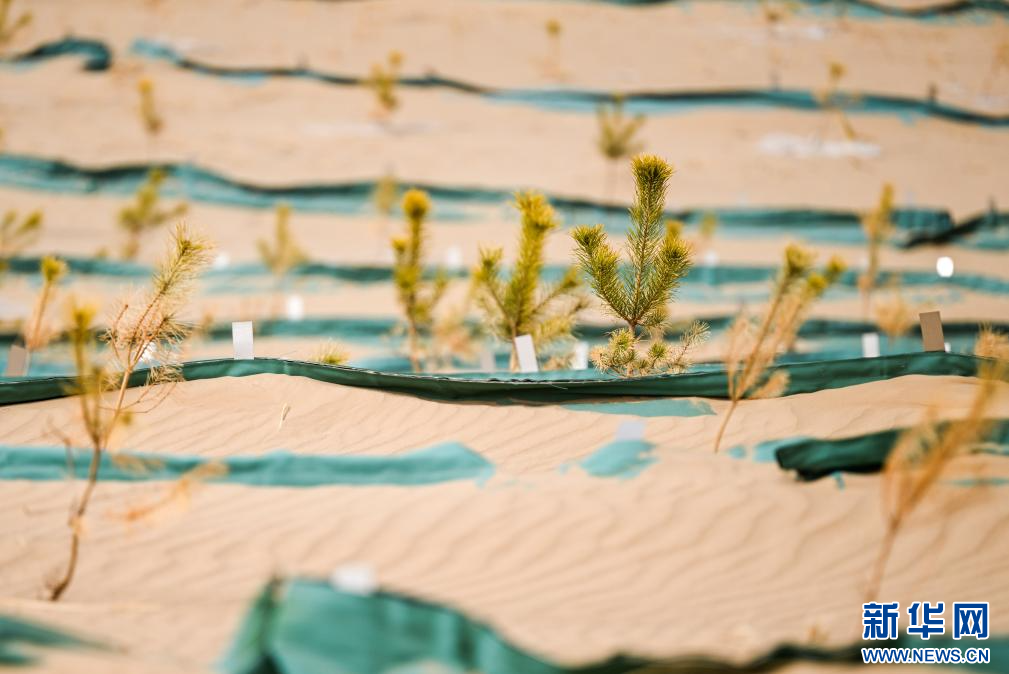 在通辽市科尔沁区大林镇拍摄的栽植在羽翼袋沙障内的樟子松(3月27日摄)。新华社记者 连振 摄