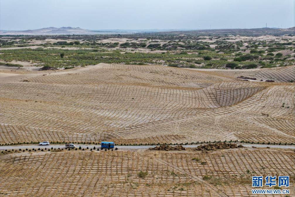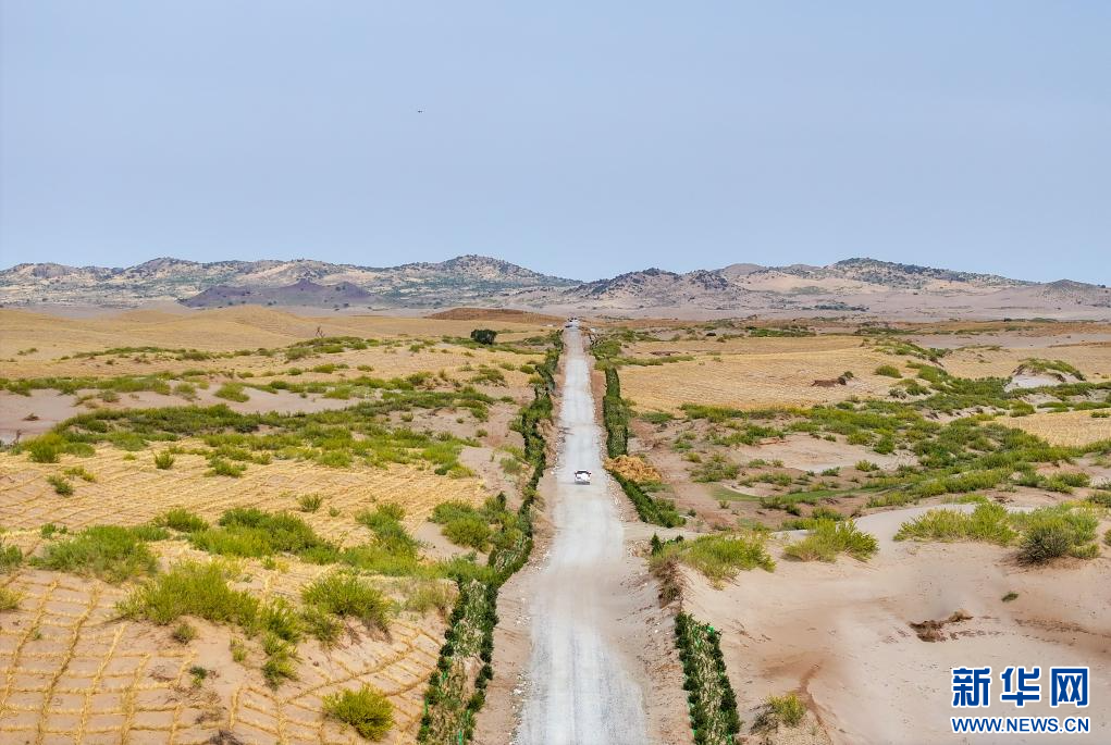在赤峰市翁牛特旗巴彦呼交嘎查其白线防沙治沙项目区,穿沙公路将沙地切割,沙丘被逐步固定(5月16日摄)。新华社记者 连振 摄
