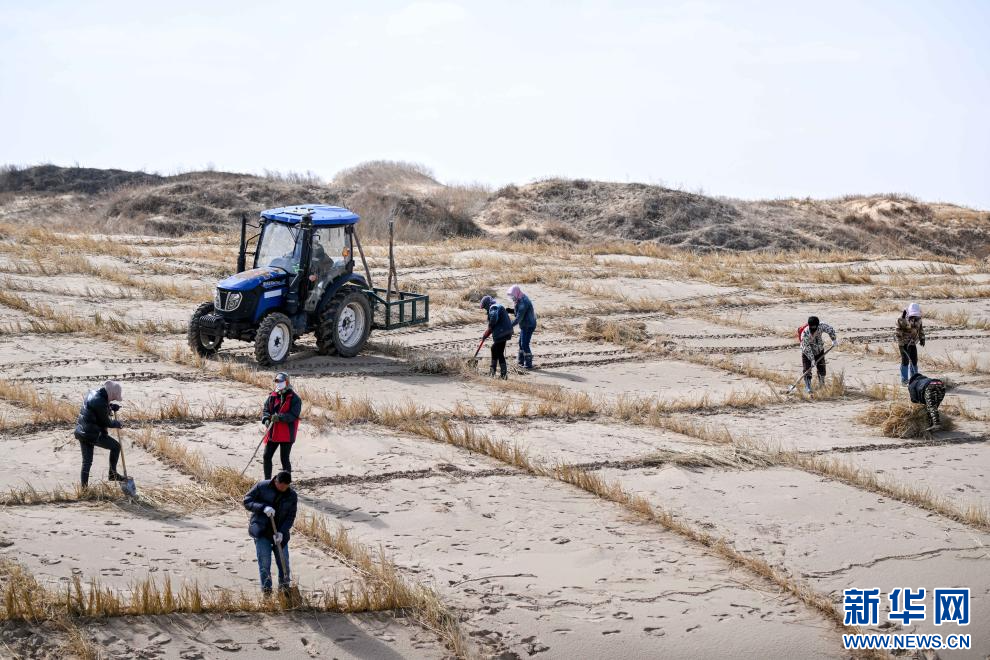 在通辽市科尔沁左翼后旗阿古拉镇,治沙工人在科尔沁沙地里打草方格(3月28日摄)。新华社记者 连振 摄