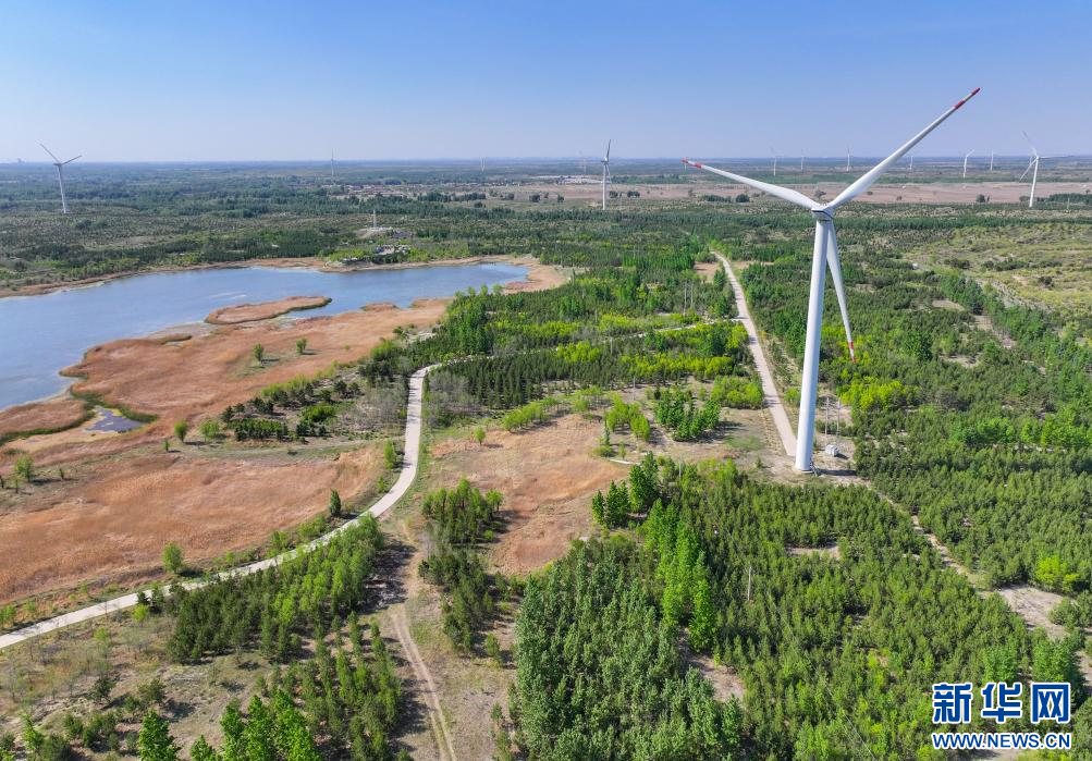 在通辽市科尔沁沙地“双百万亩”综合治理工程努古斯台项目区拍摄的风力发电机组(无人机照片,5月15日摄)。新华社记者 连振 摄