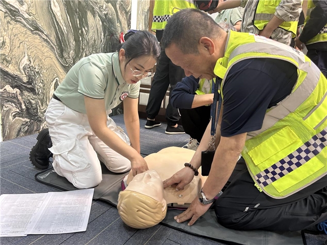 培训中,医疗培训队内讲师采取“实操解读”的培训模式,现场实操讲解各类担架的使用方法、搬运方式、心肺复苏术、止血包扎等相关知识和紧急处置,着重讲解了在操作中的关键点、风险点,结合场景模拟进行实操示范,再通过“你练我讲”的方式,逐一对担架队员的操作要领进行指导,达到了“学练同步、考学同时”的培训目的。