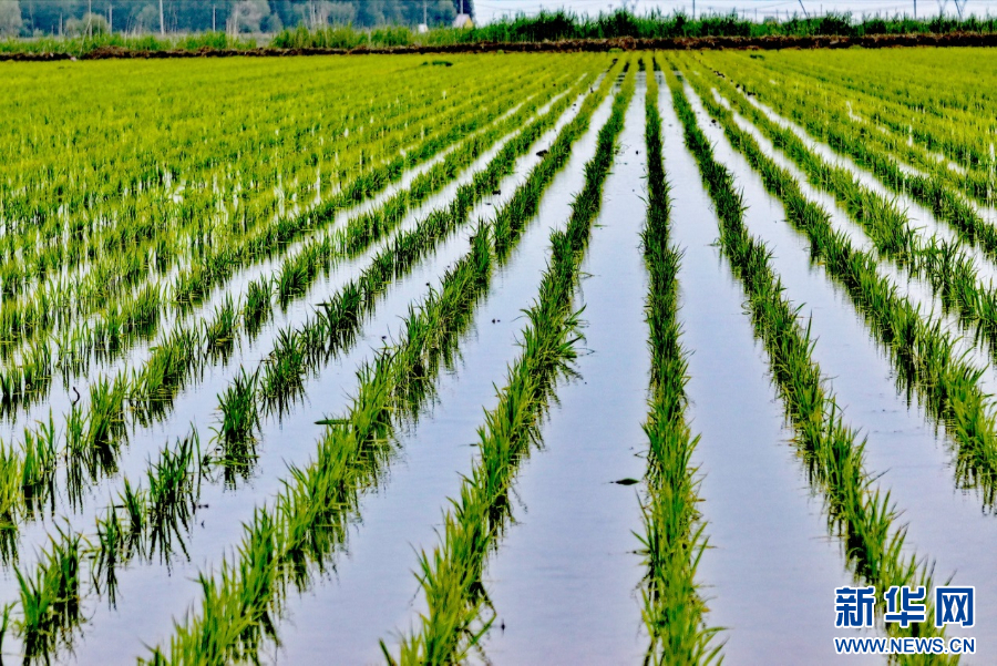 内蒙古赤峰市翁牛特旗海拉苏镇乌兰吉达盖嘎查绿油油的水稻田。新华网发(李富 摄)
