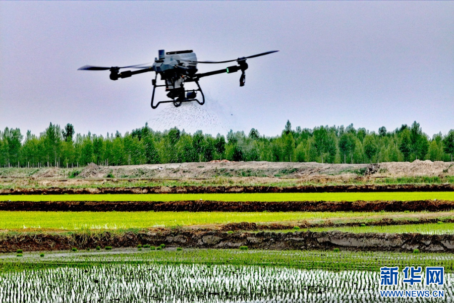 5月25日,在内蒙古赤峰市翁牛特旗海拉苏镇乌兰吉达盖嘎查生态稻田上空,一架无人机在操控人员的遥控下,有序地将返青肥播撒到稻田。新华网发(李富 摄)