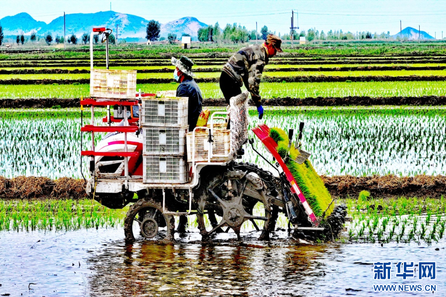 5月25日,在内蒙古赤峰市翁牛特旗海拉苏镇乌兰吉达盖嘎查生态稻田里,农民正在进行机械插秧作业。新华网发(李富 摄)