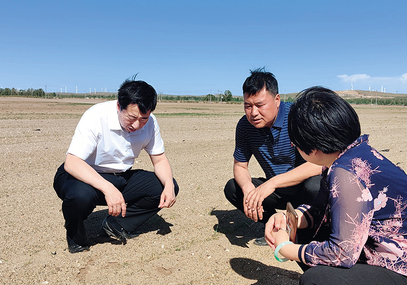李建军(左一)在内蒙古化德县公腊忽洞乡调研农田受旱情况(2022年6月18日摄) 乌兰察布市委宣传部供图