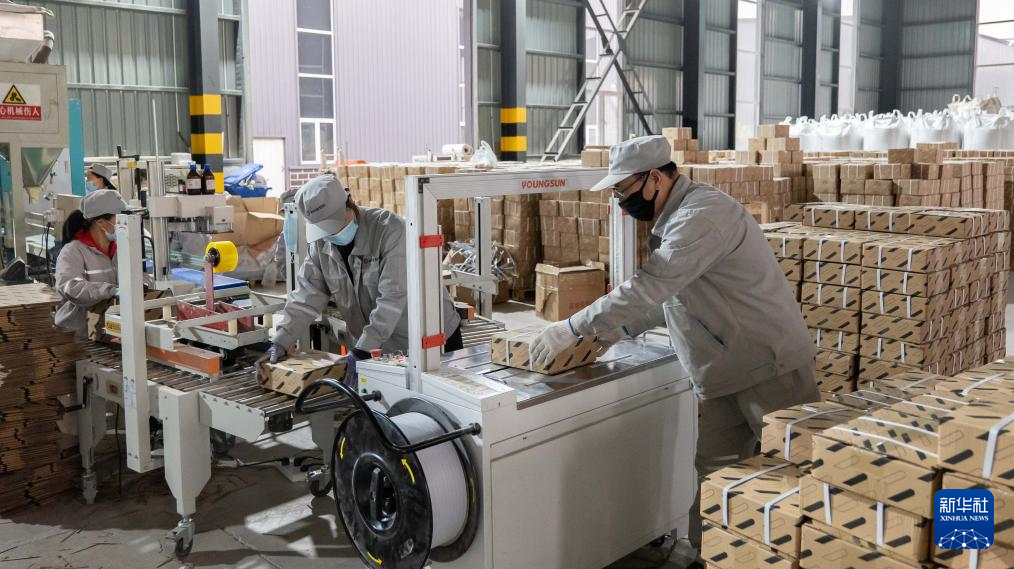 2024年4月26日,赤峰市蒙宏新材料有限公司生产车间里,工人正在对猫砂进行装袋。新华社发