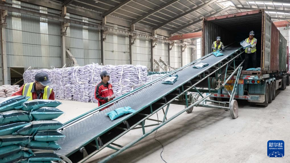 2024年4月26日,宁城县金龙膨润土有限公司的工人正在装载猫砂,准备运往大连港。新华社发