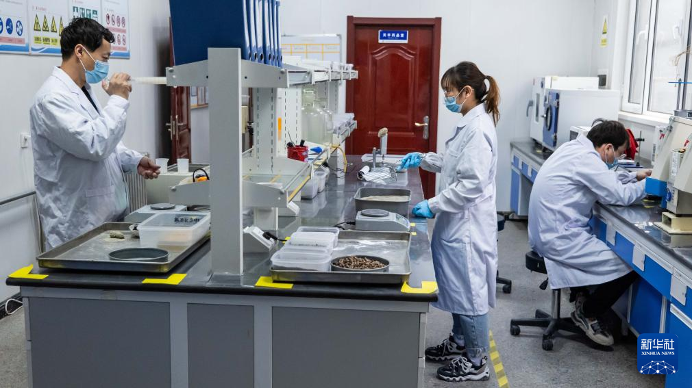2024年4月26日,赤峰市蒙宏新材料有限公司的技术人员在测试猫砂产品。新华社发