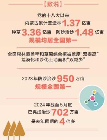党的十八大以来,内蒙古累计造林种草、防沙治沙规模均居全国第一,在祖国北疆构筑起一道万里绿色长城。