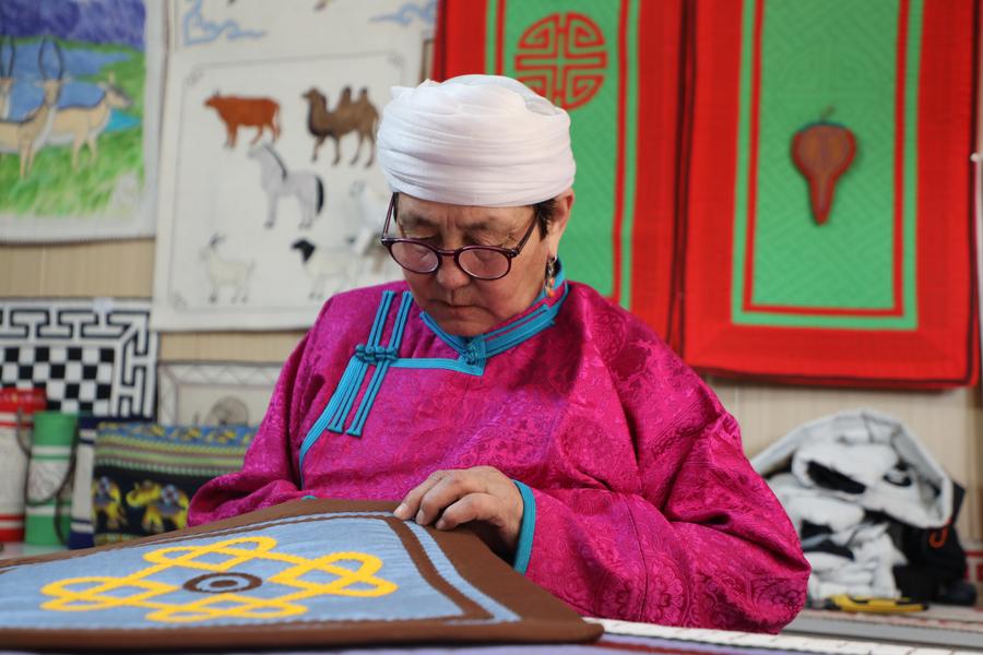 “小时候在放羊的间隙,我就制作驼绒线。等忙完白天的牧活,晚上拿着新做的驼绒线,让母亲教我缝制毡子。”从缝制坐垫,到缝制蒙古包外围,孟根其其格的手艺越来越好,成为草原上远近闻名的“巧绣娘”。