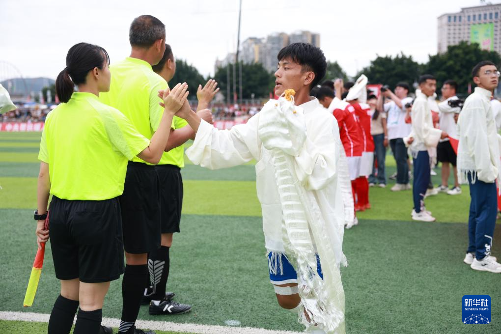 此间战罢,另一场“青春”对决又拉开帷幕,对阵双方是日喀则市珠峰雪鹰队和榕江县青少年“班超”联队。赛前握手环节,珠峰雪鹰队队员给对手献上哈达表示敬意和祝福,榕江县青少年“班超”联队则给对方戴上了印有“人生就应该有追球”字样的“村超”主题围巾。