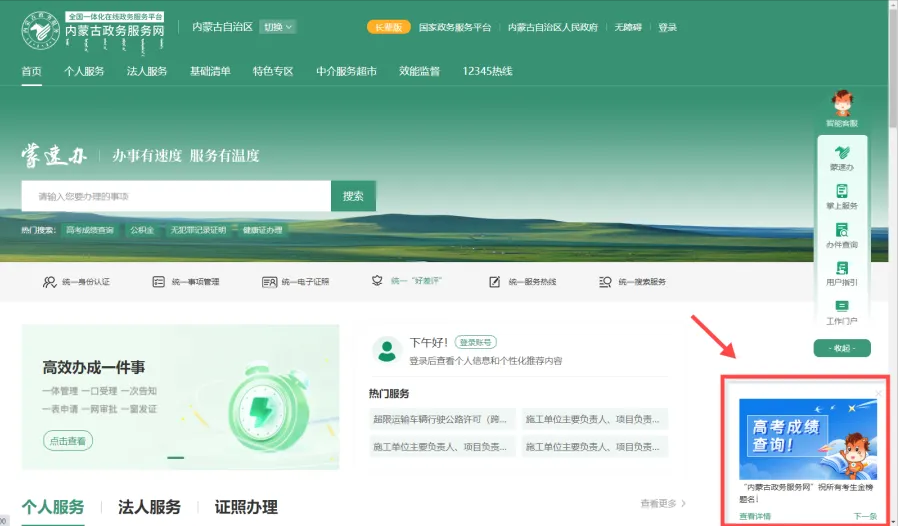 作为内蒙古自治区打造的全区一体化政务服务平台,“蒙速办”自上线以来始终秉持“办事有速度、服务有温度”的理念,为全区企业和群众提供各类贴心服务。目前,“蒙速办”已上线部分高考服务,广大考生和家长可以享受“高考成绩查询”“录取结果查询”“录取通知书邮寄情况”等一站式贴心服务。