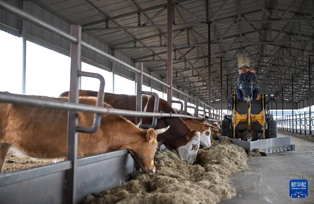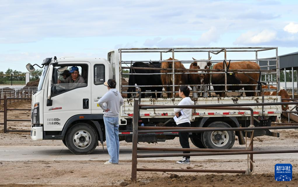 6月23日,在内蒙古锡林郭勒盟苏尼特左旗澳仑牧业有限公司的托管代养牛圈内,工作人员驾驶车辆整理饲草料,以便牛群进食。该公司为牧民提供肉牛托管代养服务,目前已接收400多头牛。新华社记者 贝赫 摄
