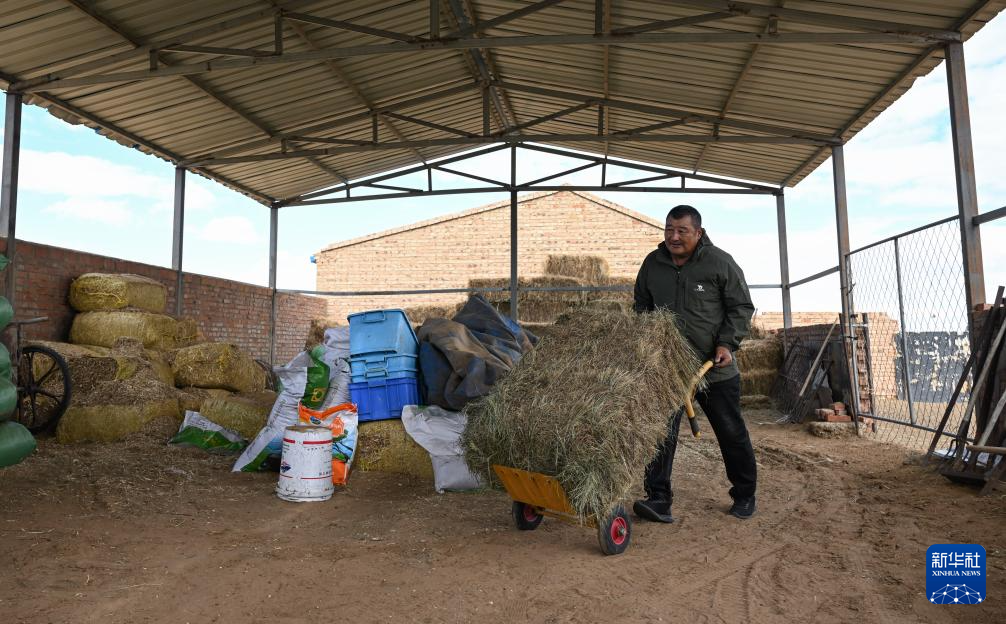 6月23日,在内蒙古锡林郭勒盟苏尼特左旗,牧民宝力道巴特尔在家中搬运饲草料。新华社记者 贝赫 摄
