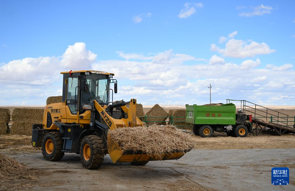 6月23日,工作人员在内蒙古锡林郭勒盟苏尼特左旗一处饲草料加工储备站运输饲草料。