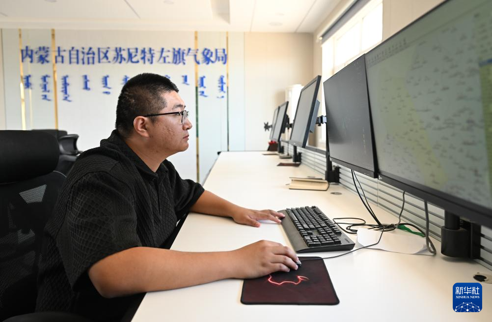 6月23日,工作人员何欣在内蒙古锡林郭勒盟苏尼特左旗气象局监测旱情。新华社记者 贝赫 摄