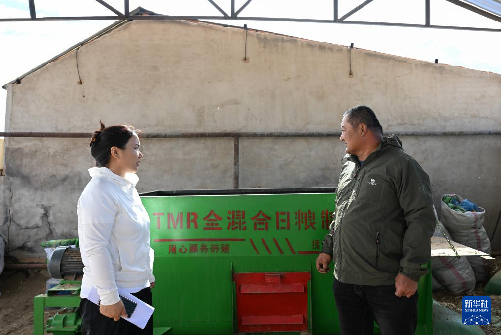 6月23日,在内蒙古锡林郭勒盟苏尼特左旗牧民宝力道巴特尔家,苏尼特左旗农牧局工作人员娜荷雅(左)向宝力道巴特尔了解饲草料储备情况。新华社记者 贝赫 摄