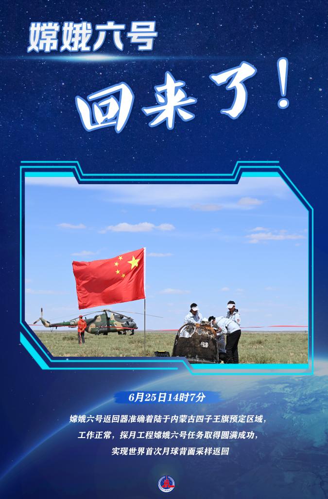 6月25日14时7分,嫦娥六号返回器准确着陆于内蒙古四子王旗预定区域,工作正常,探月工程嫦娥六号任务取得圆满成功,实现世界首次月球背面采样返回。