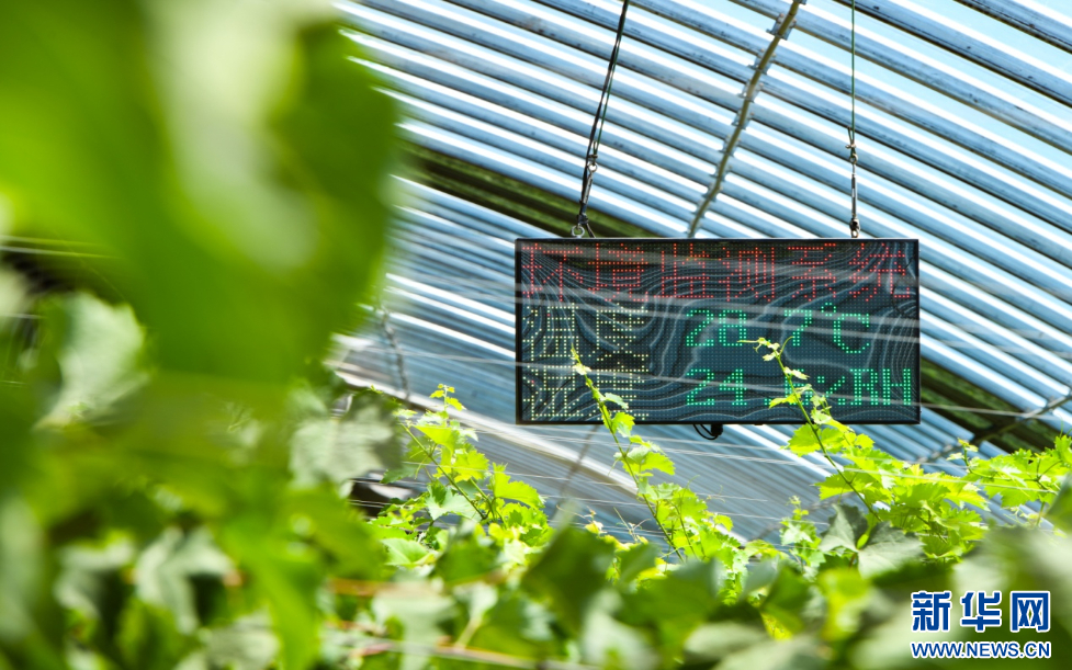 6月26日,土默特左旗一家葡萄采摘园内的环境监测系统实时显示温度、湿度。新华网发(杨鑫 摄)