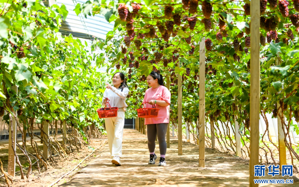 6月26日,游客在土默特左旗一家葡萄采摘园内采摘葡萄。新华网发(杨鑫 摄)