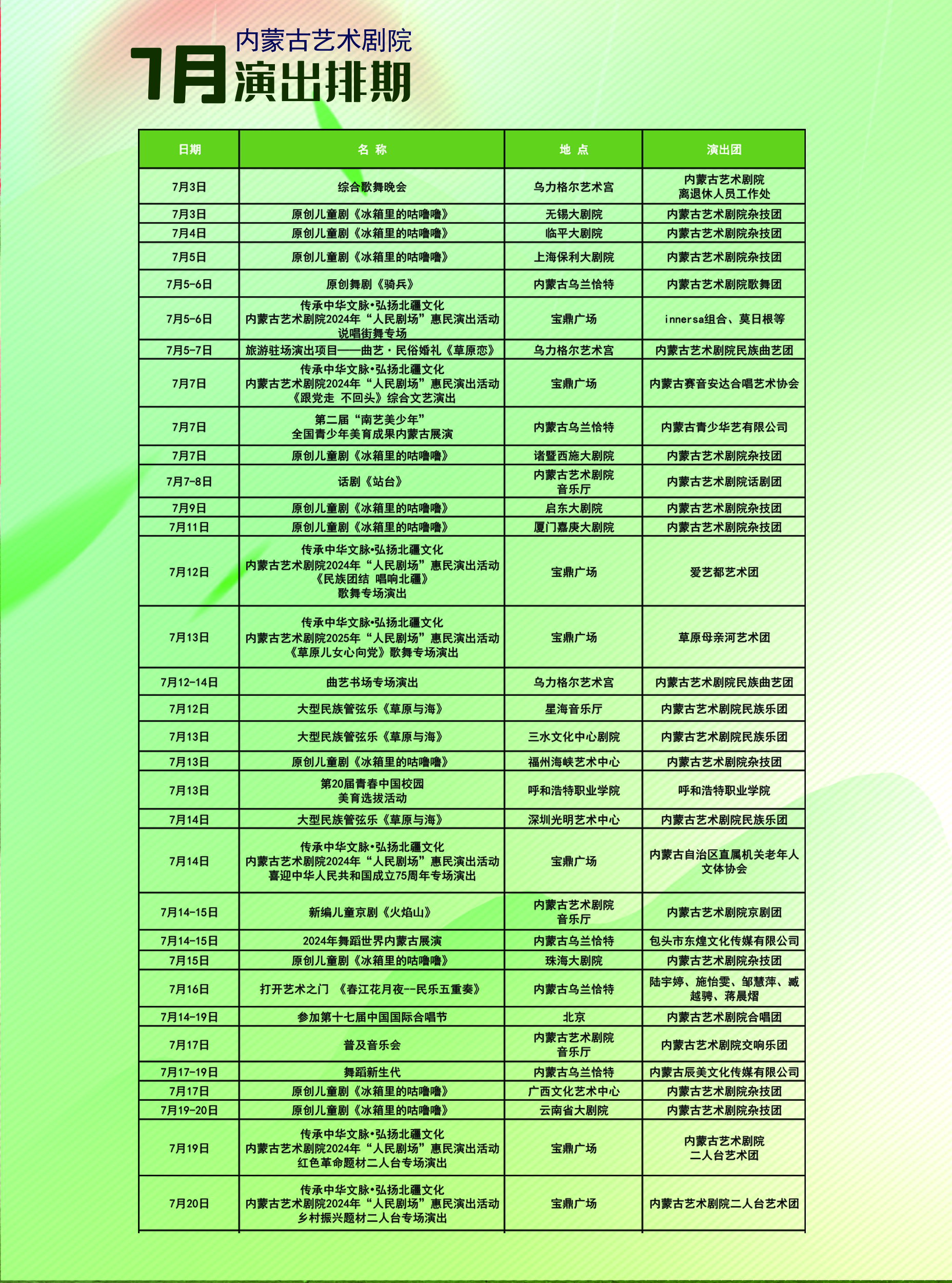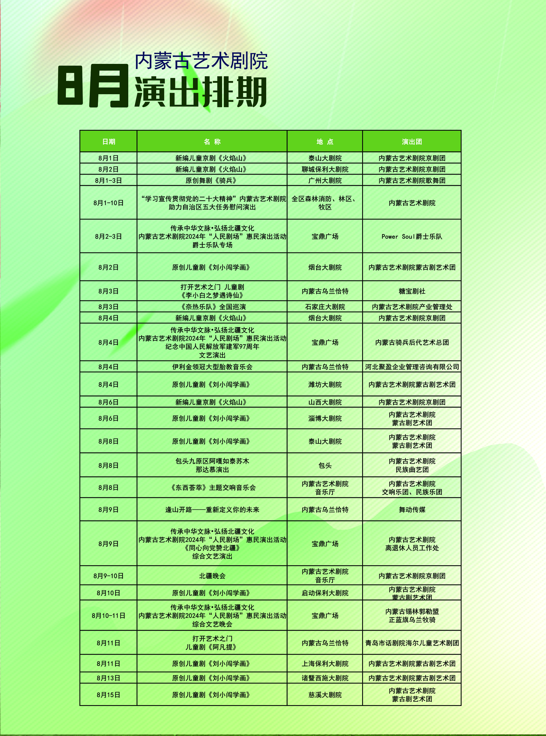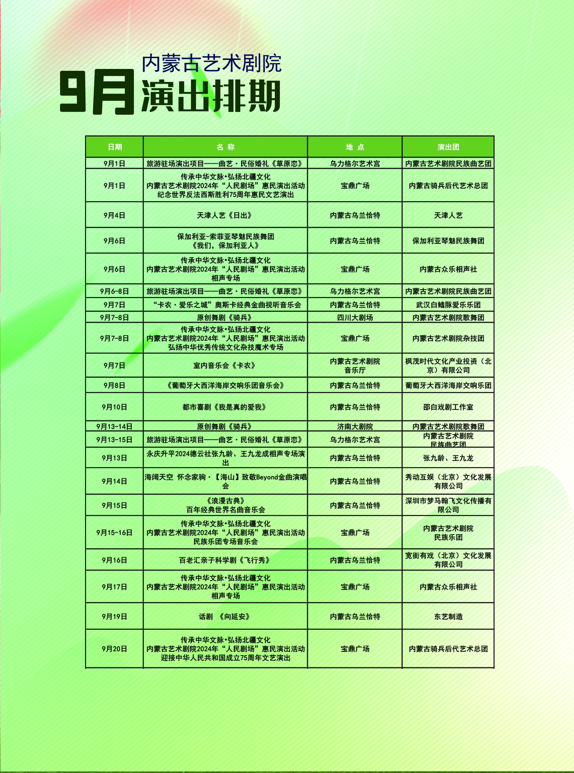 内蒙古艺术剧院7月、8月、9月演出排期