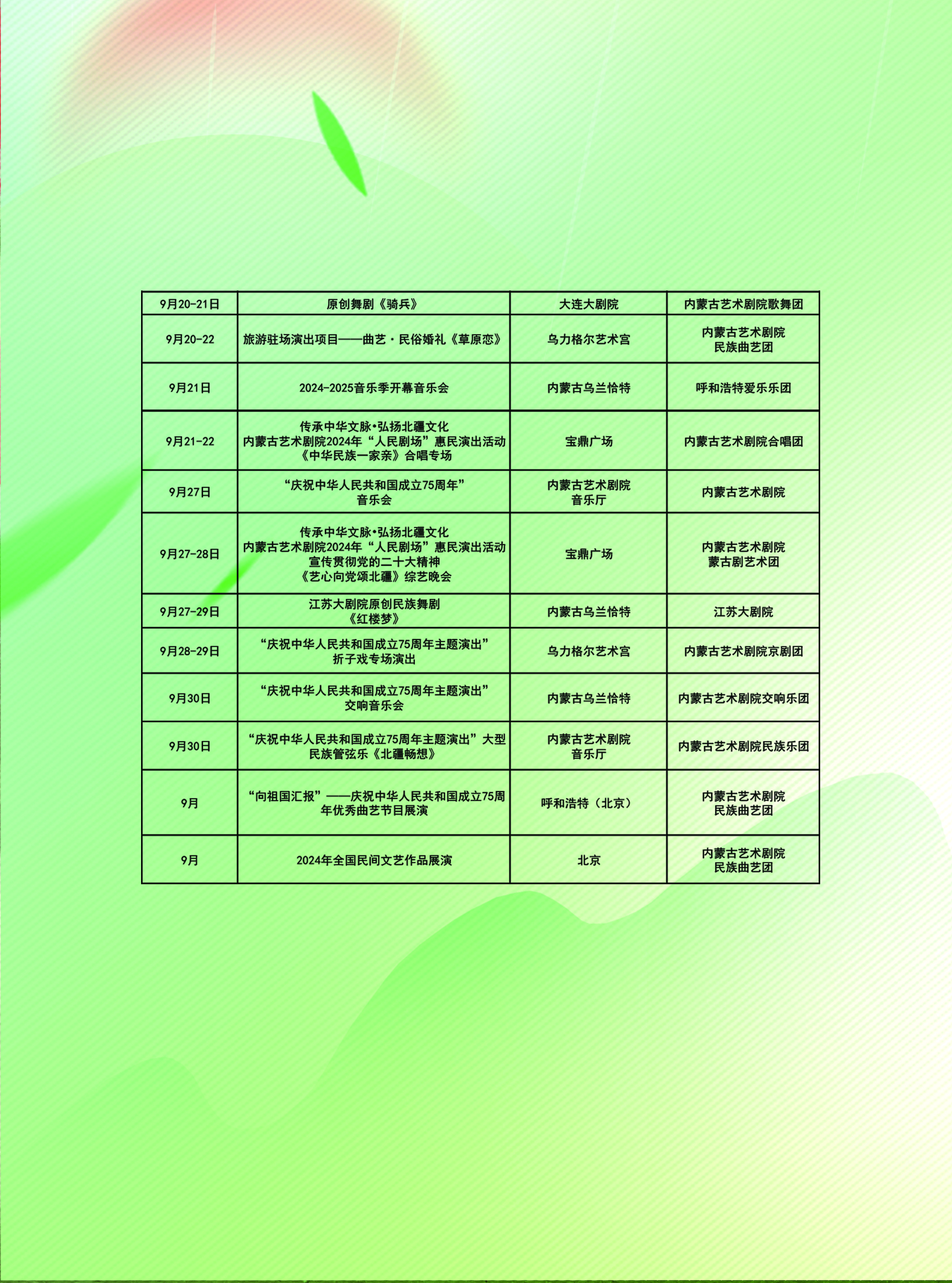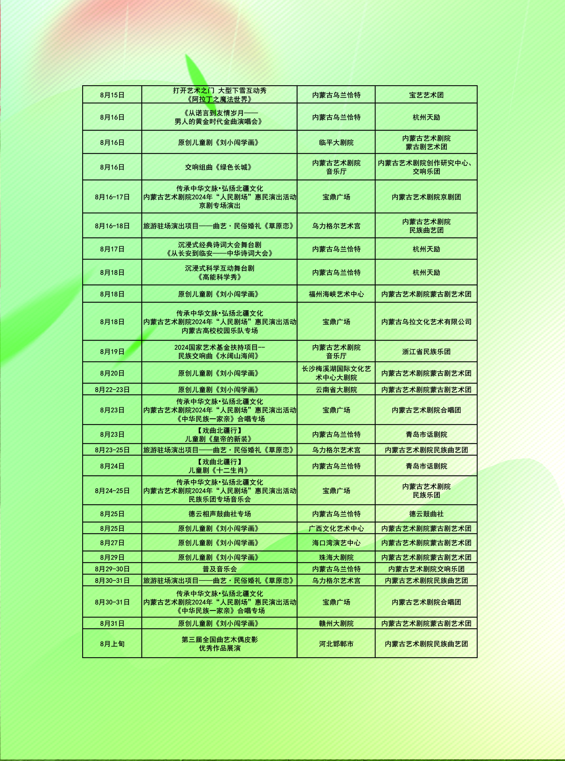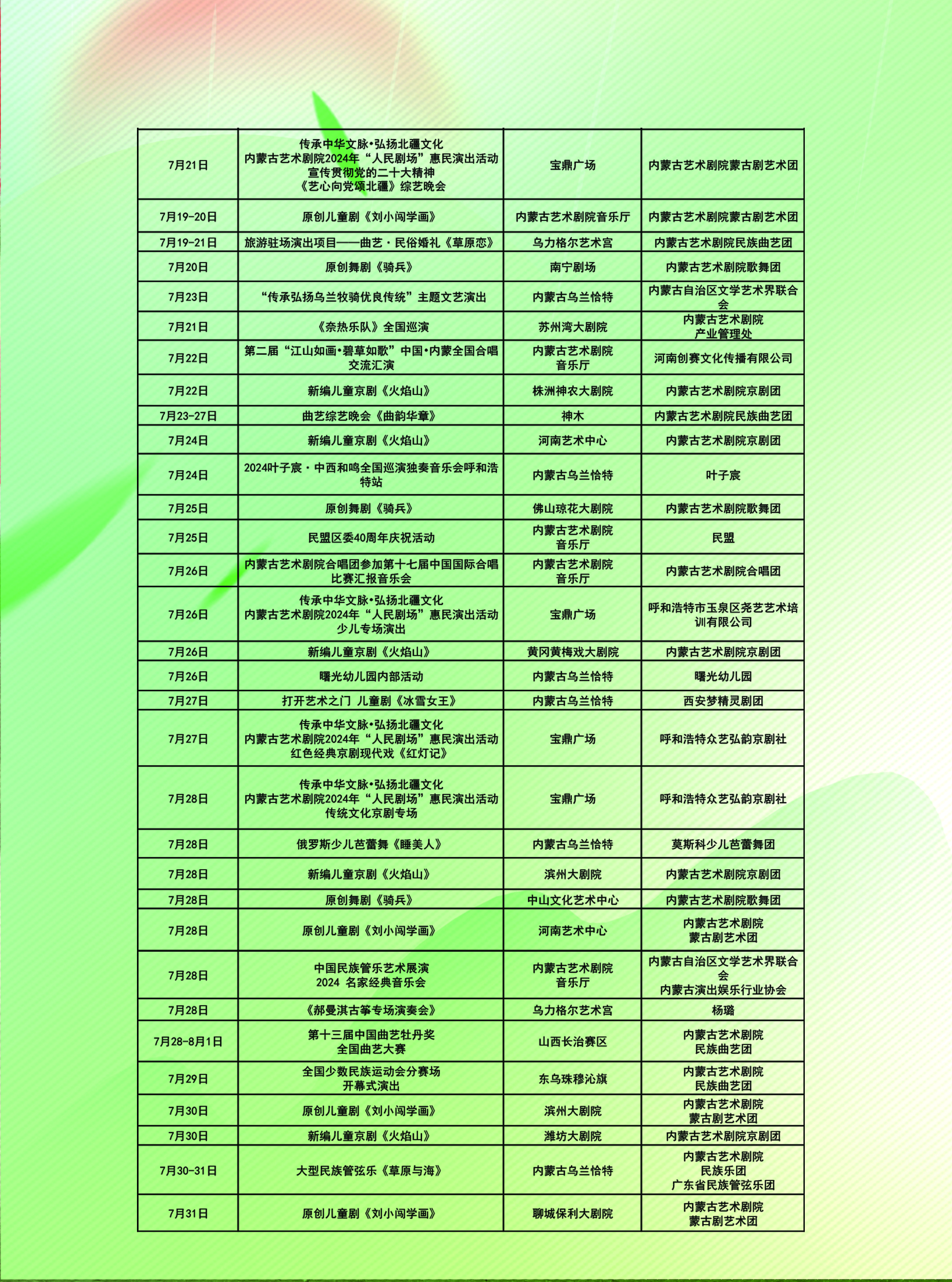 内蒙古艺术剧院7月、8月、9月演出排期