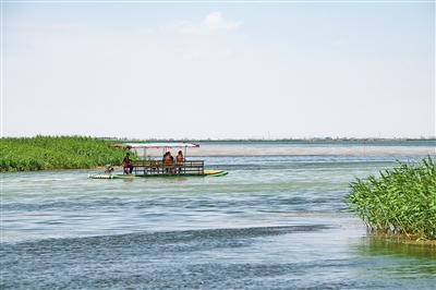 游客乘船畅游乌梁素海。 本报记者 怀特乌勒斯 摄