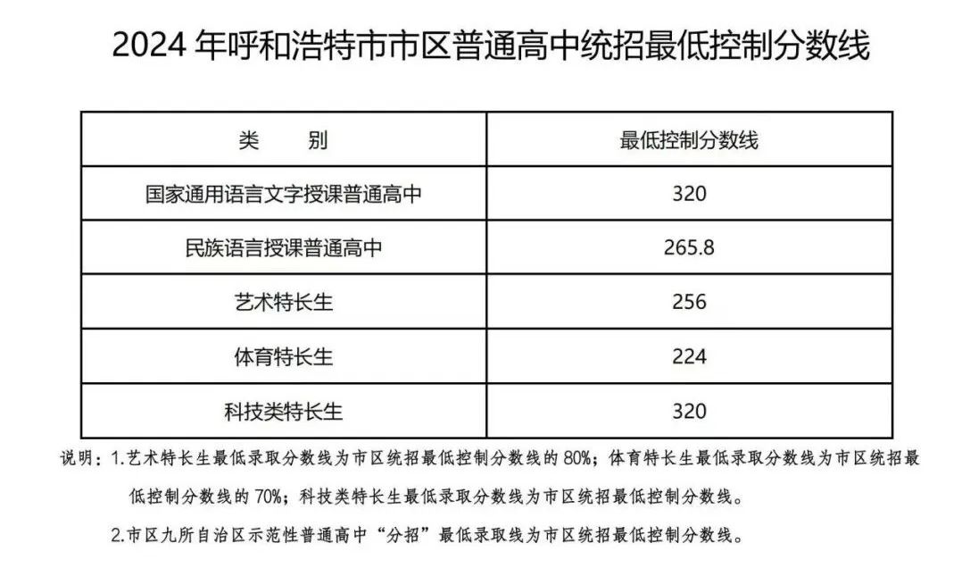 7月9日,呼和浩特市教育招生考试中心公布了呼和浩特市2024年中考成绩及市区普通高中统招最低控制分数线,国家通用语言文字授课普通高中最低控制分数线320分,民族语言授课普通高中265.8分,艺术特长生256分,体育特长生224分,科技类特长生320分。