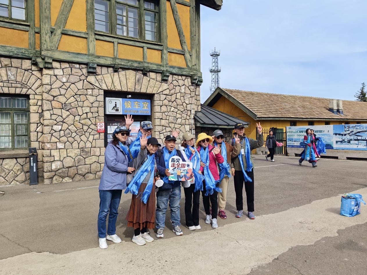 在阿尔山网红火车站,来自安徽旅行团的游客正在开心地游玩拍照。随着阿尔山旅游高峰期到来,这里的绿皮小火车承载着游客们对诗与远方的向往,驶入阿尔山避暑纳凉、寻花望山。