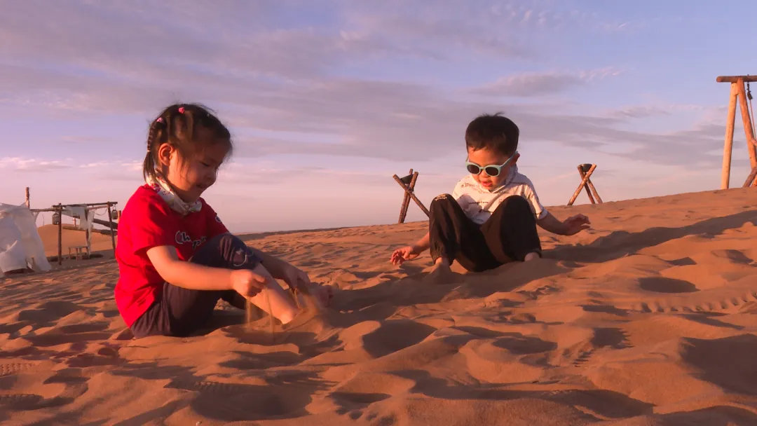 在沙漠里玩耍的孩子们。(孪井滩生态移民示范区融媒体中心 供图)