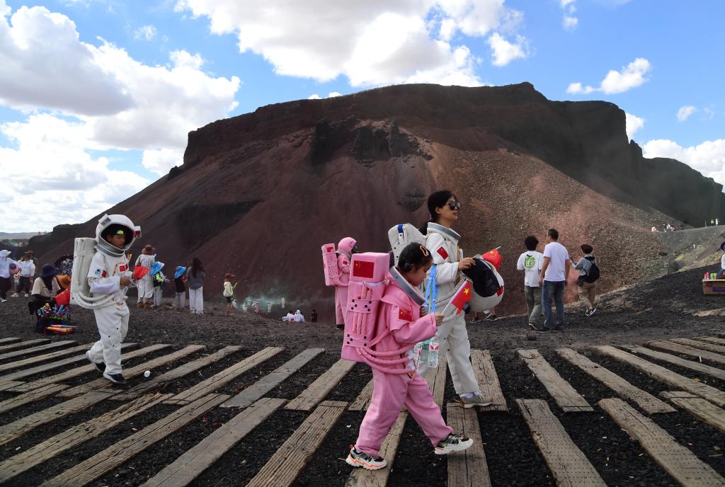 ↑2024年7月28日,游客在内蒙古自治区乌兰察布市乌兰哈达火山群游玩。CICPHOTO/孙慧军 摄