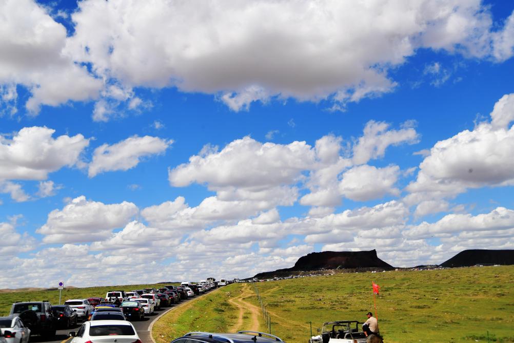 ↑2024年7月28日,在内蒙古自治区乌兰察布市,前往乌兰哈达火山群的车辆络绎不绝。CICPHOTO/孙慧军 摄
