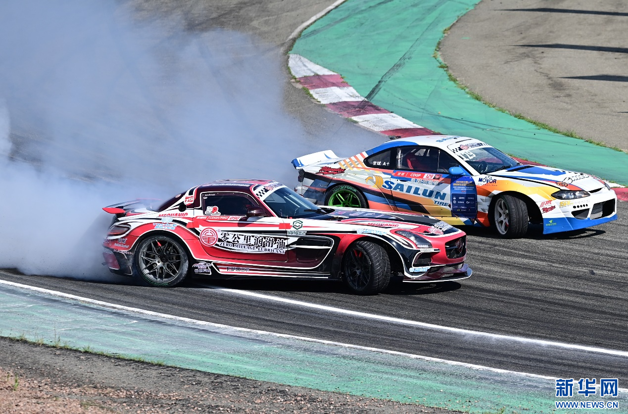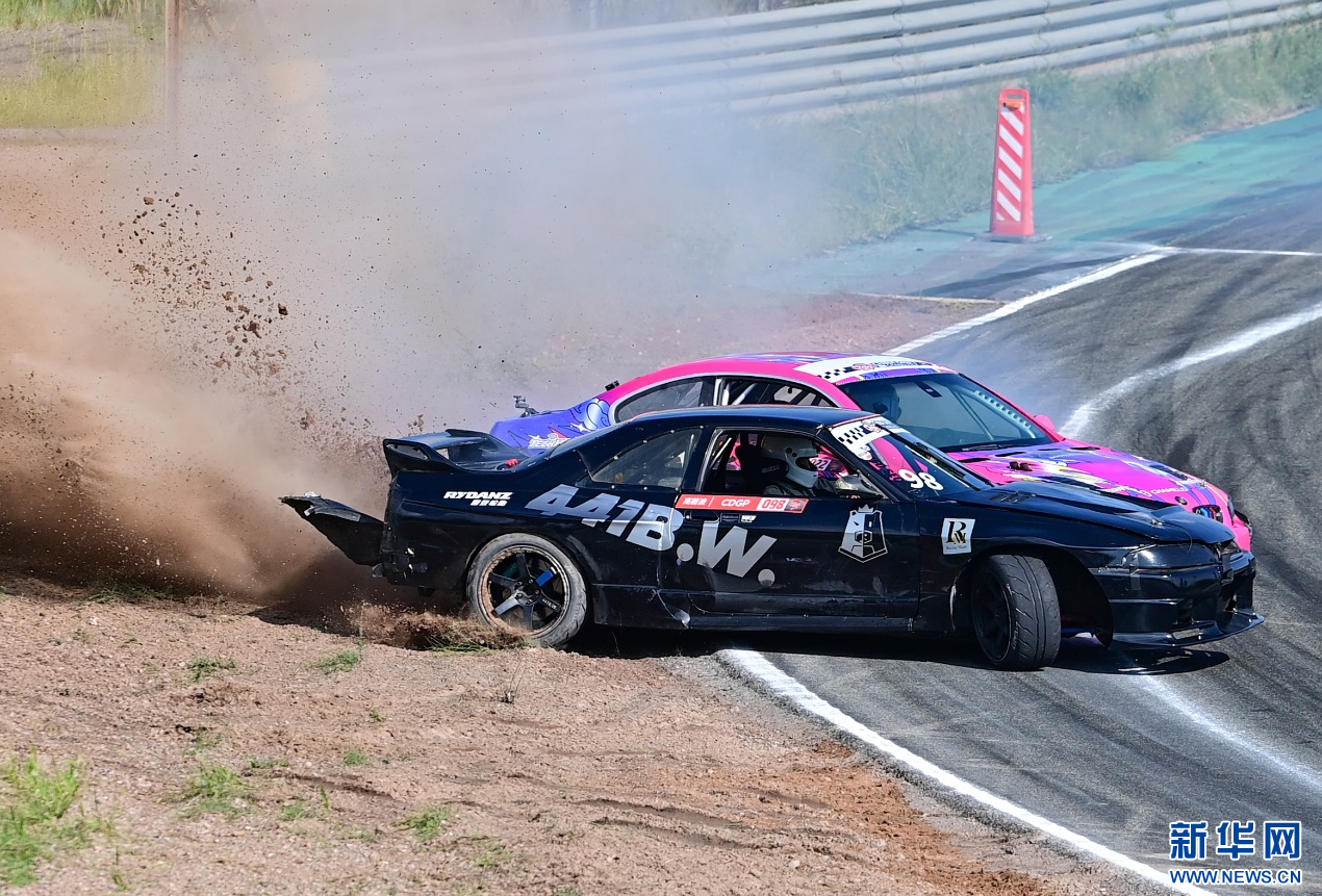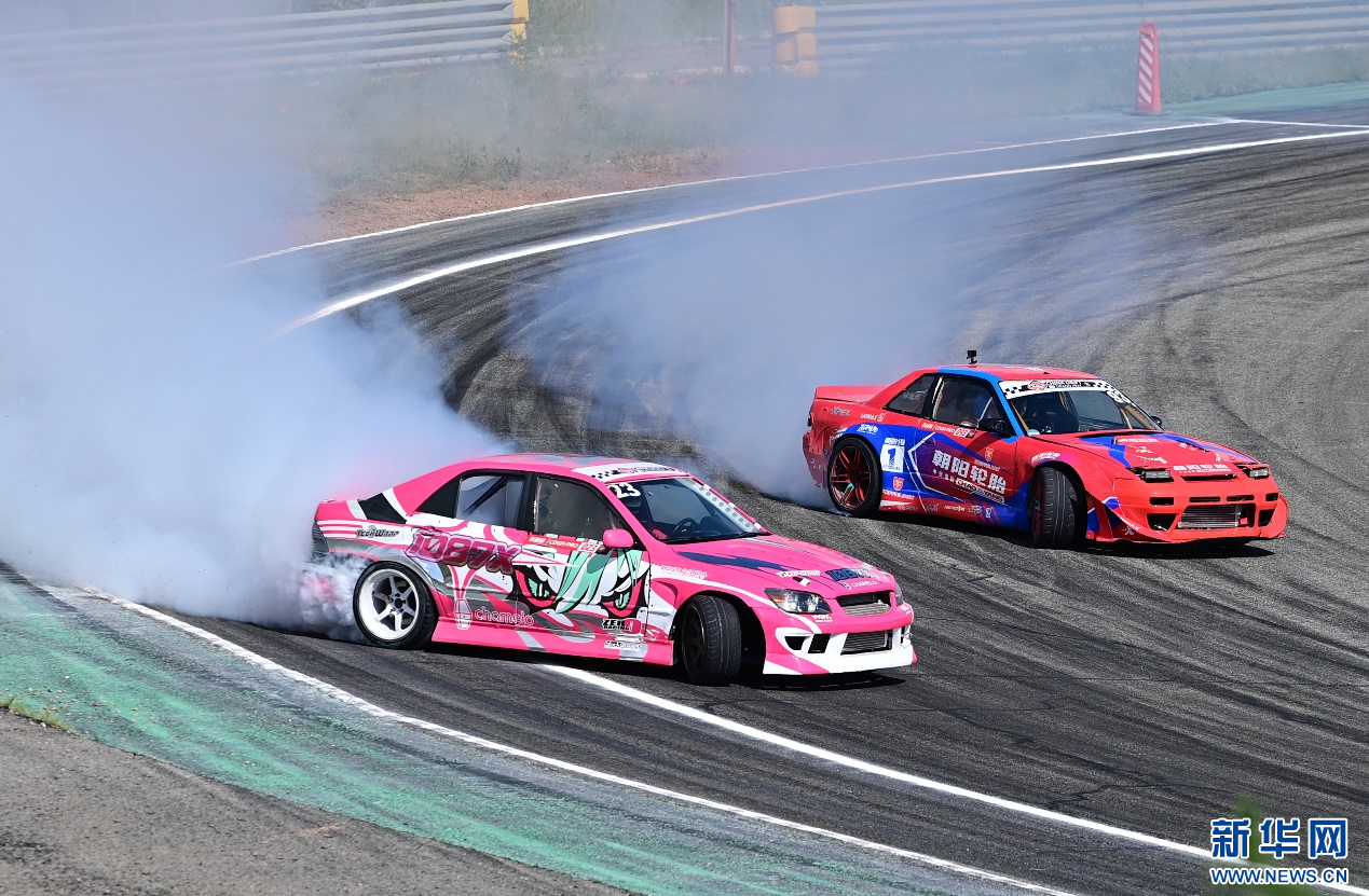 8月4日,在内蒙古鄂尔多斯国际赛车场,参赛车辆在中国汽车漂移大奖赛鄂尔多斯站CDGP组别比赛中。新华网发(王正 摄)