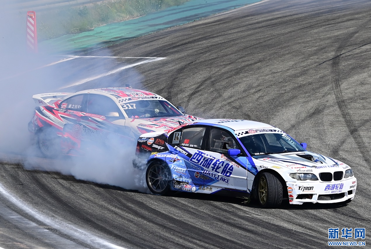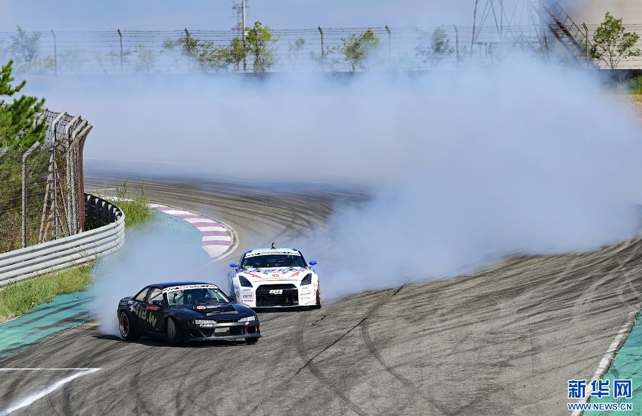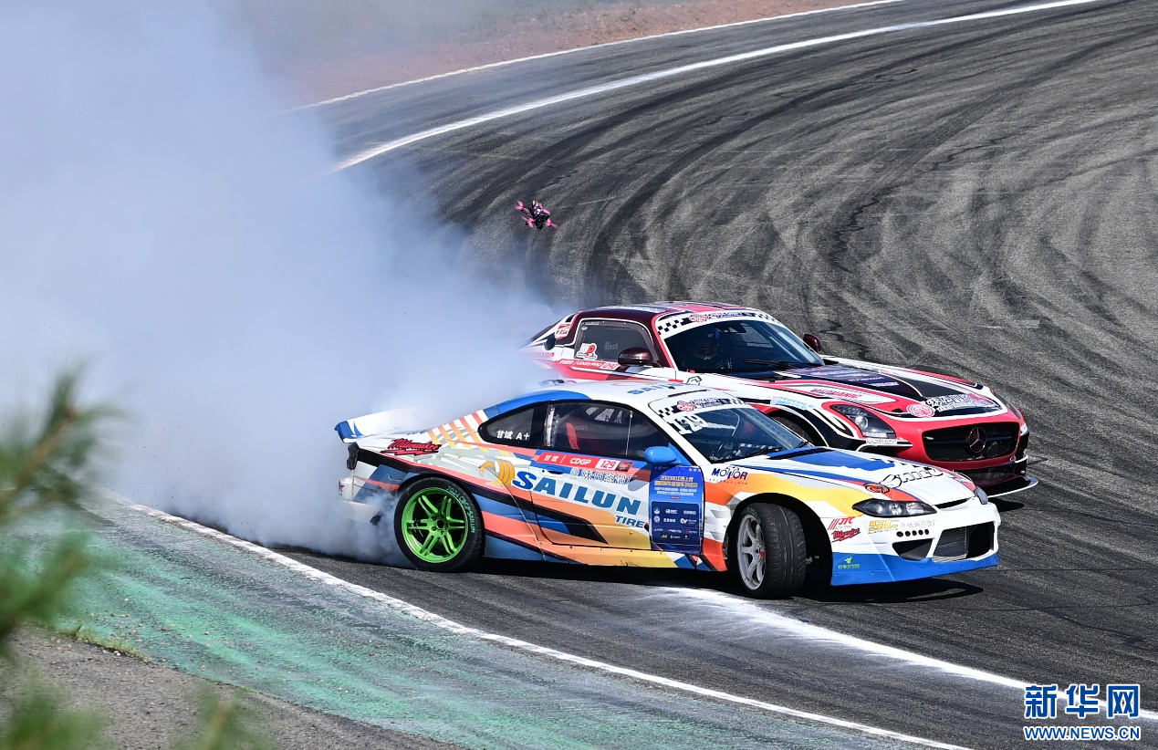 8月4日,在内蒙古鄂尔多斯国际赛车场,参赛车辆在中国汽车漂移大奖赛鄂尔多斯站CDGP组别比赛中。新华网发(王正 摄)