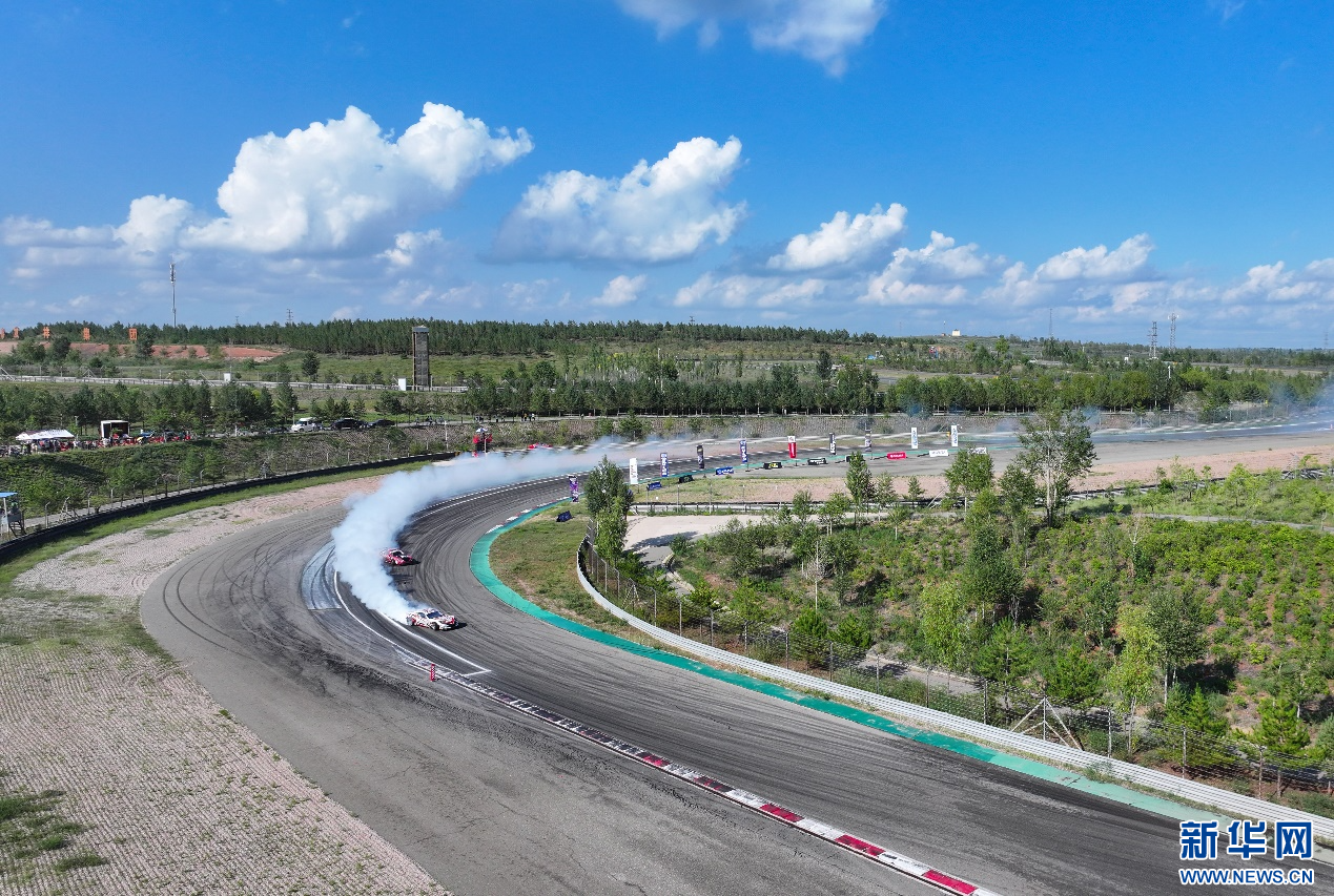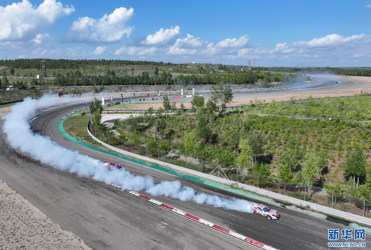 8月4日,在内蒙古鄂尔多斯国际赛车场,参赛车辆在中国汽车漂移大奖赛鄂尔多斯站CDGP组别比赛中(无人机照片)。新华网发(王正 摄)
