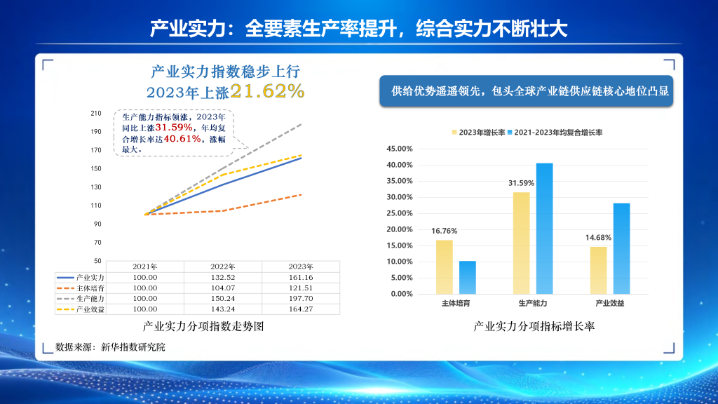 “包头市全球产业链、供应链核心地位日益凸显。产业生产能力指标领涨,是拉动产业实力指数的关键驱动,2023年同比涨幅31.59%,年均复合增长率达40.61%,涨幅最大。”新华指数研究院副院长亓芳芳表示。