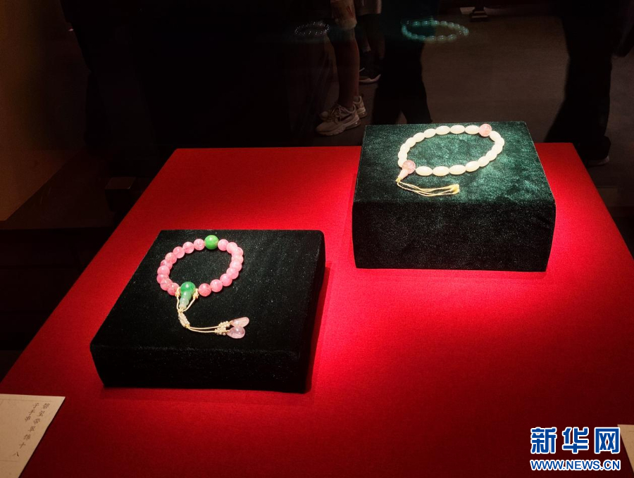 8月23日,呼和浩特博物馆展出的碧玺带翠饰十八子手串。新华网李倩 摄
